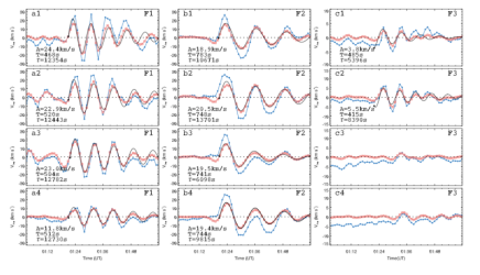 此外,研究中还详细分析了由于日冕波导致的暗条的振荡特征。暗条F1在水平和垂直方向上经历了相似的五个周期,推测实际为垂直振荡,水平振荡信号因其靠近日面边缘而由投影效应产生。暗条F2在水平和垂直方向上周期差异明显,应是两种方向的混合振荡。暗条F3则振荡信号较弱,在其左部可以检测到小尺度垂直振荡。该项研究表明波和暗条相互作用是一个非常复杂的过程,其振荡形式和波的入射方向没有多大关系。
