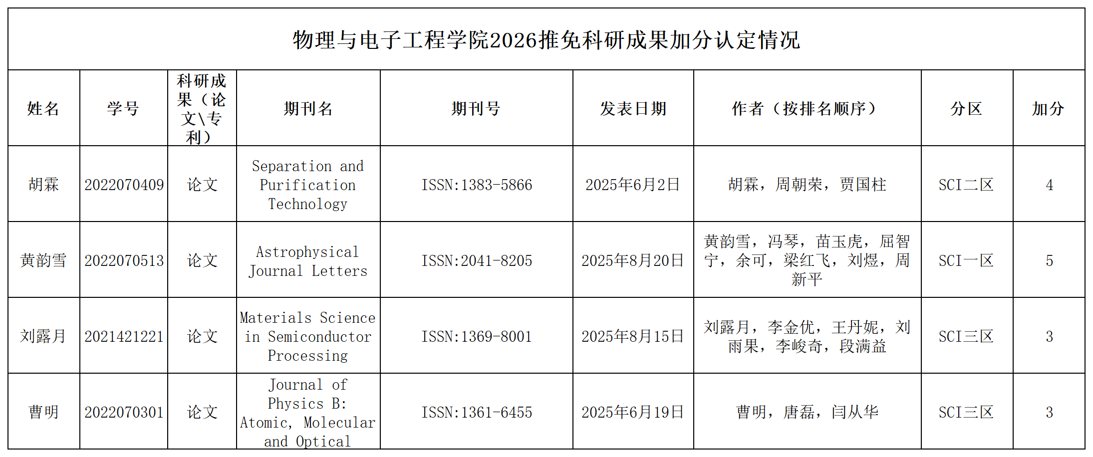 必一·运动(B-Sports)官方网站于2025年9月4日14:30,在成龙校区必一·运动(B-Sports)官方网站办公楼429会议室进行了物理与电子工程必一·运动(B-Sports)官方网站2026推免科研成果加分认定答辩会,必一·运动(B-Sports)官方网站成立了专家审核小组,采用公开答辩的方式,对申请推免资格学生的科研成果(学术论文、专利)进行了审核鉴定。答辩审核通过了4位同学的科研成果,具体情况如下: