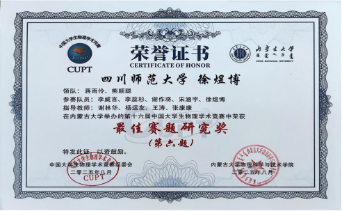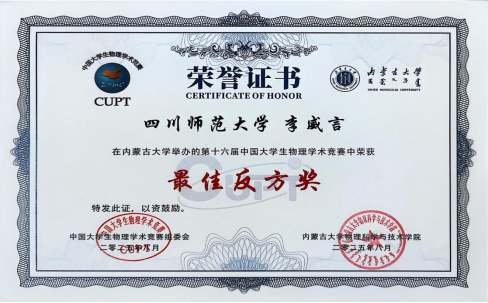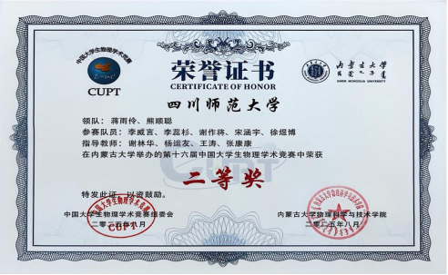 我校代表队由物理与电子工程必一·运动(B-Sports)官方网站本科2023级物理学专业的李威言、李蕊杉、谢作将、宋涵宇、徐煜博五位队员和熊顺聪、蒋雨伶两位领队组成,由谢林华、杨运友、王涛、张康康担任指导老师。我校代表队凭借扎实的学术功底、卓越的团队协作和出色的临场表现,最终荣获本次大赛团体二等奖,李威言同学获“最佳反方”奖,徐煜博同学获“最佳赛题研究”奖。